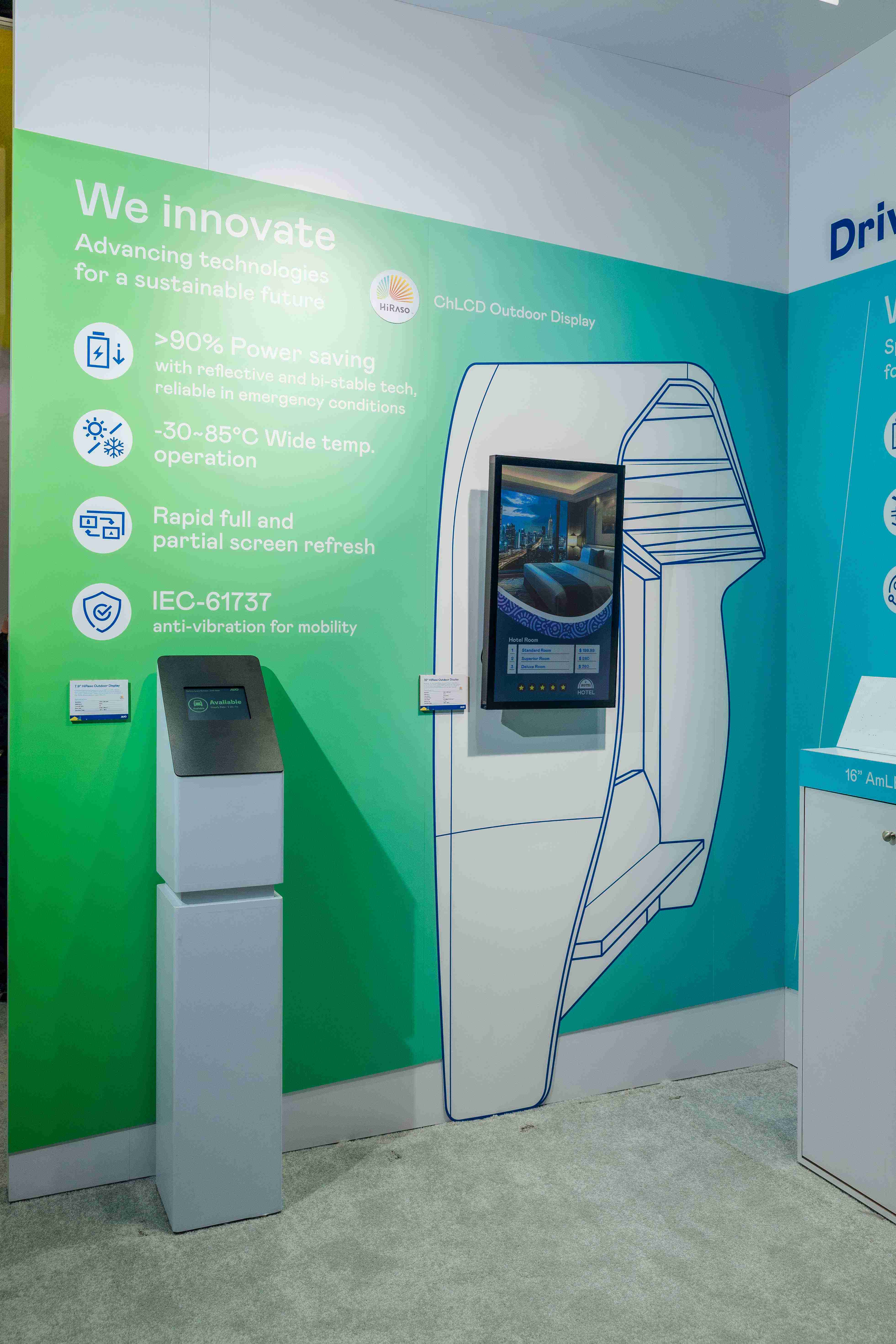 HiRaso胆固醇液晶显示器运用反射环境光线的方式,,呈现影像显示时零耗能的环保省电诉求,,,,光线愈强愈能呈现绝佳的色彩饱和度及显示效果,,同时在摄氏-30度至85度间宽温的使用优势,,,为户外电子看板的新首选。。。。