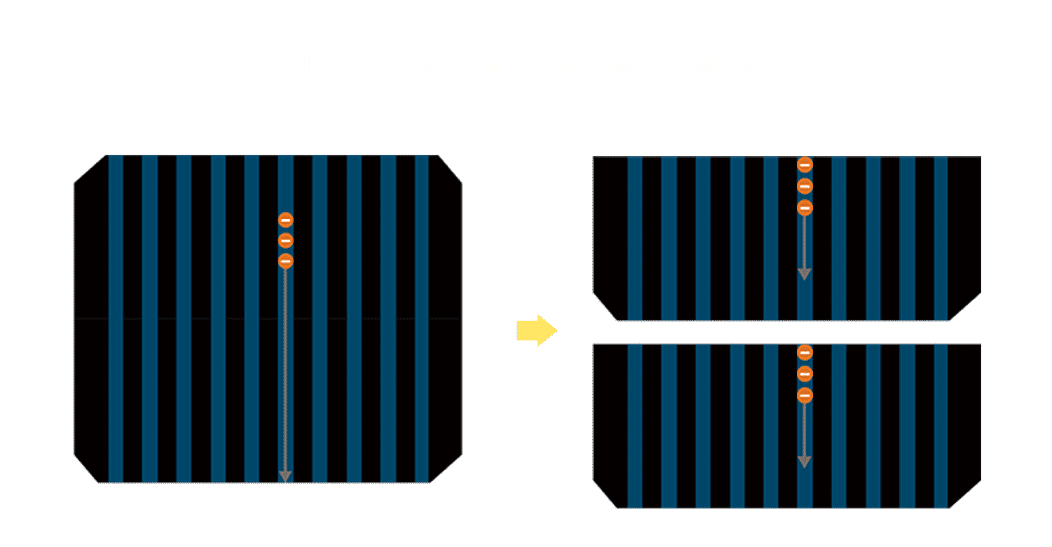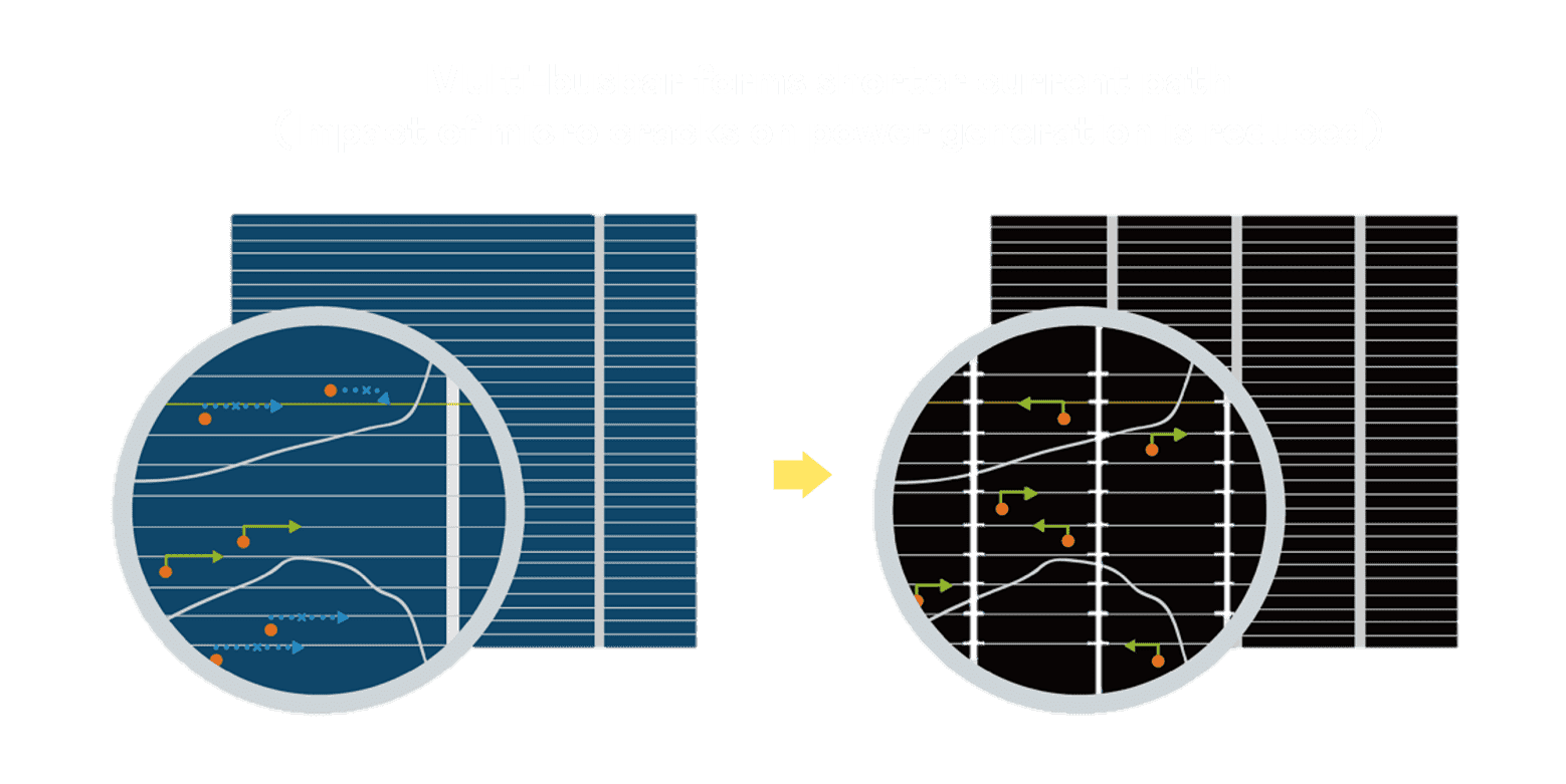 • 电池使用多条铜导线 (Copper wire) 于电池片上形成较短的电流路径,,,,提高电流收集效率,,采用圆形设计的铜导线较传统扁平式的铜焊带 (Ribbon),,,可增加入射至电池的光线量。。