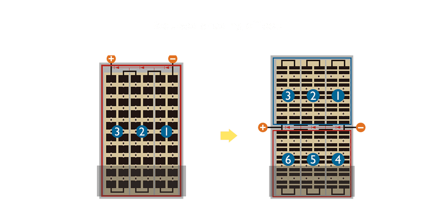 • 结合半切电池,,降低遮阴影响、、、提升模组抗隐裂能力、、并减少电阻损耗,,,进一步提升模组发电效能。。