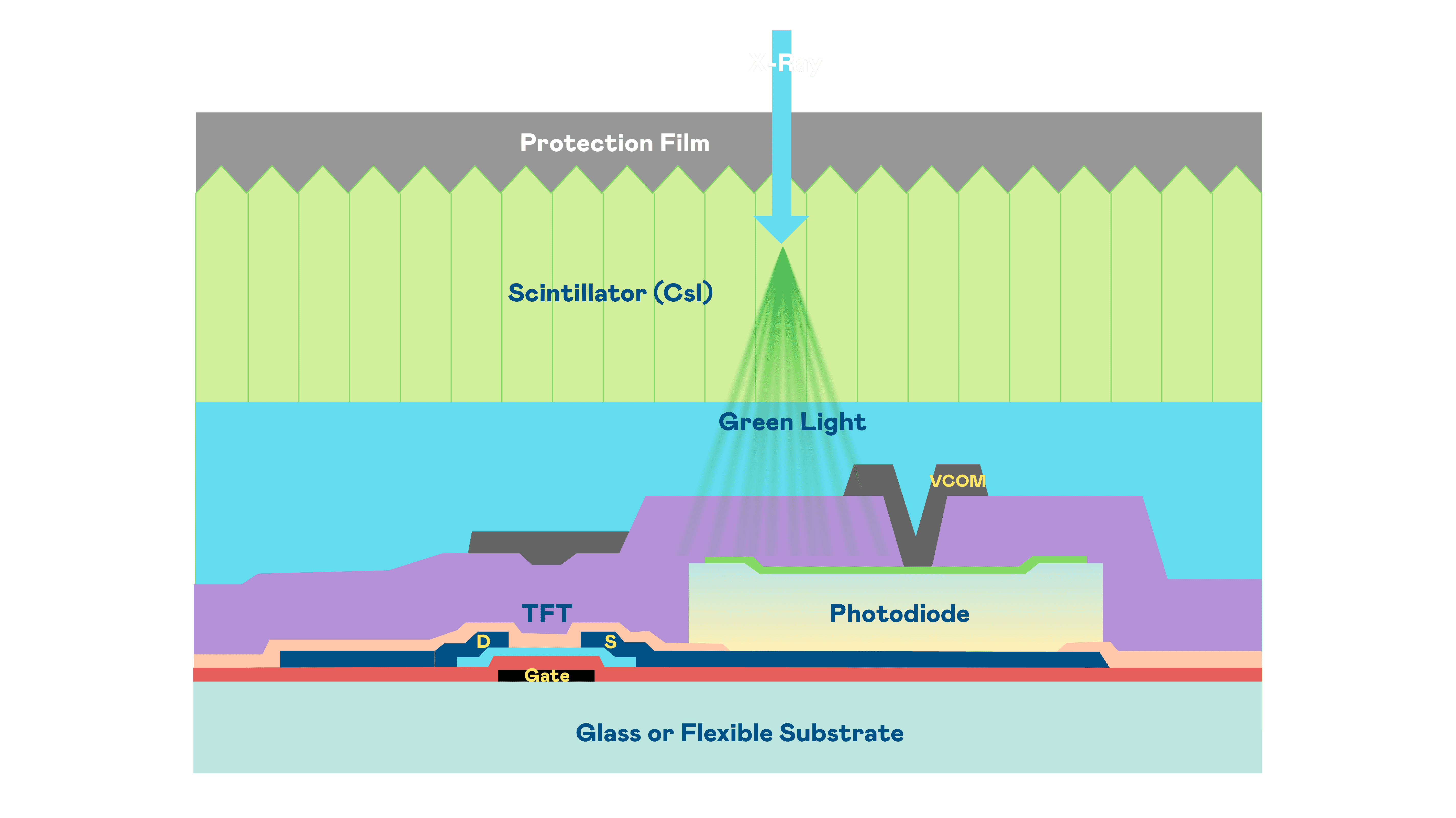 尊龙z6的X光影像感测阵列使用薄膜电晶体 (TFT) 作为每个像素的读取开关,,搭配光电二极体(Photodiode)的光电转换元件,,用以感测X光影像讯号。。。。
